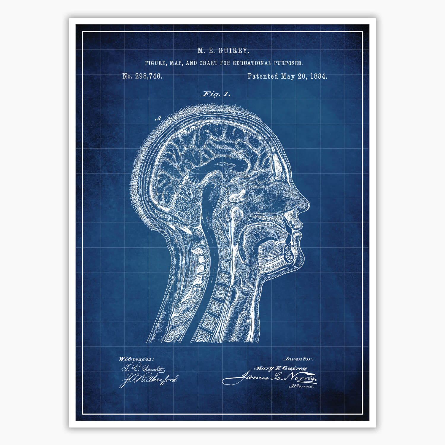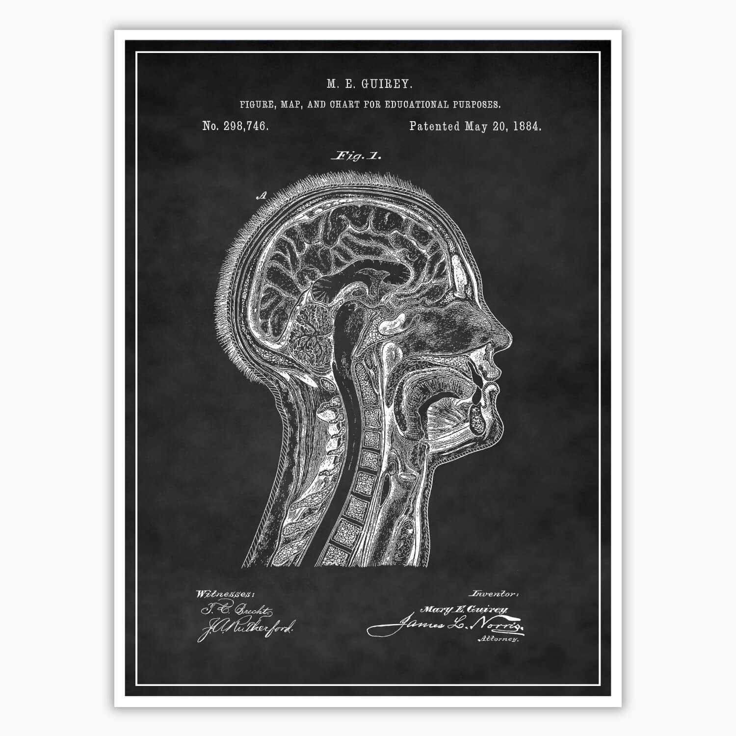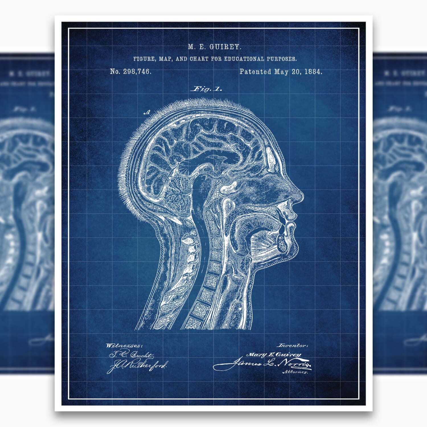 Introducing our Anatomical Head Patent Poster, featuring the original patent blueprint by inventor M E Guirey. With attention to detail and captivating design, this patent poster is a remarkable centerpiece for horror enthusiasts, collectors, and macabre lovers. Showcase your admiration for everything spooky with the Anatomical Head Patent Poster, beautifully rendered on 260 GSM Semi-Gloss Photo Paper.