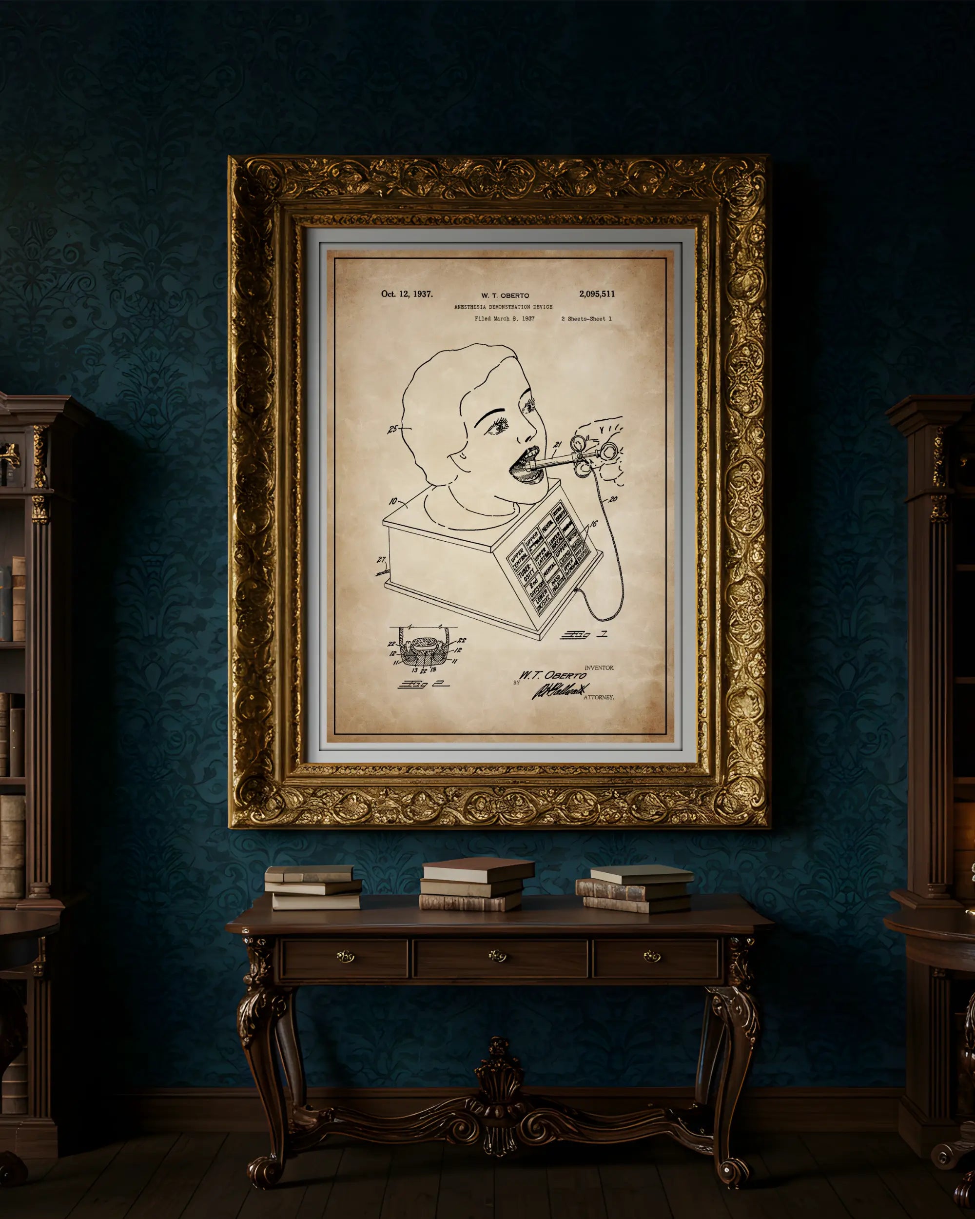 As the day begins to slow and you settle into your evening routine, your eyes might catch the delicate mechanical lines of this Anesthesia Device Patent Poster. The restored vintage diagram reveals the quiet ingenuity behind an early medical tool and presents it with clear and understated charm.