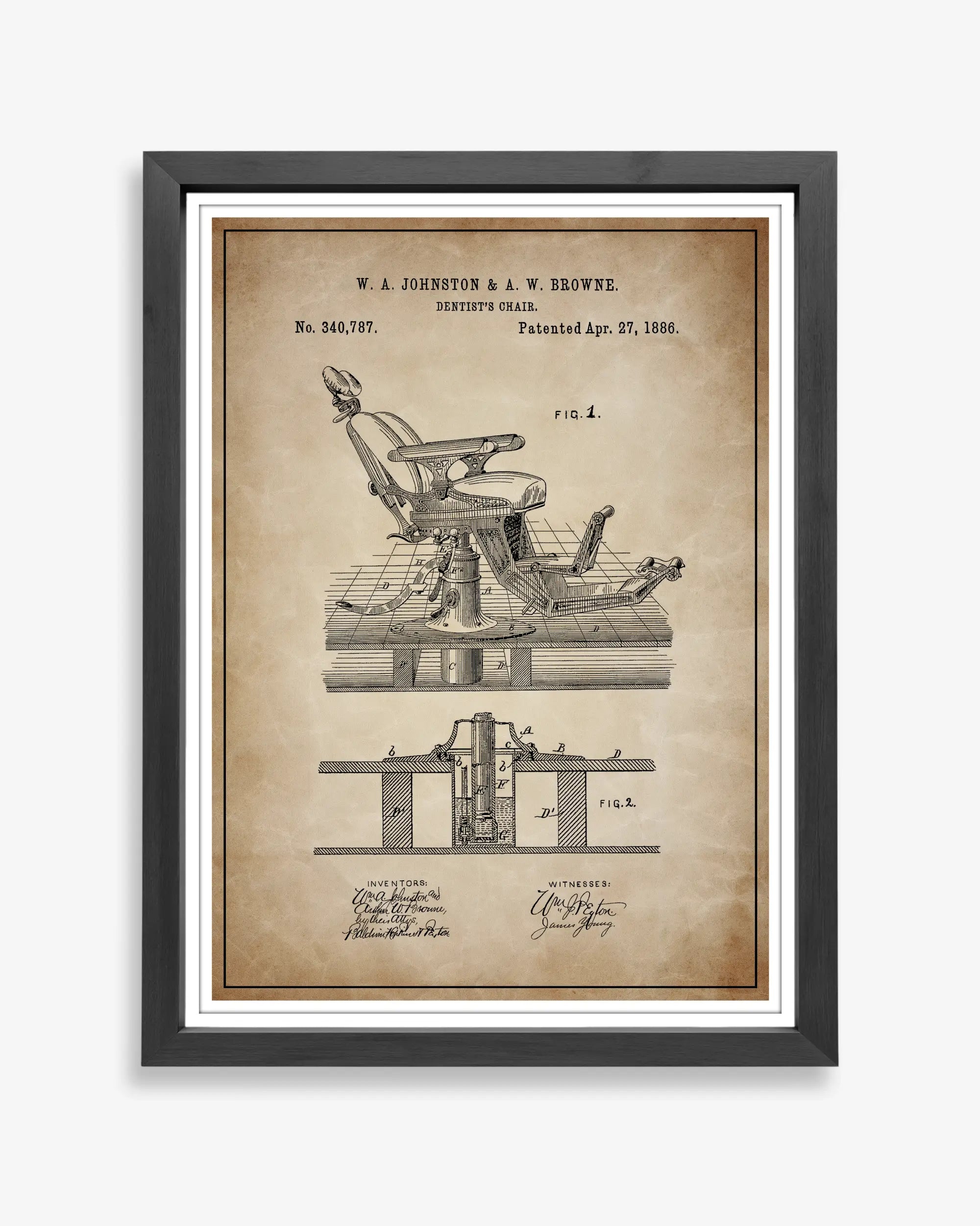As you move through the room, the Dentist's Chair Patent Poster offers a moment of quiet reflection. The restored illustration reveals the mechanical design of an early dental chair, complete with vintage detailing and clean structural clarity.