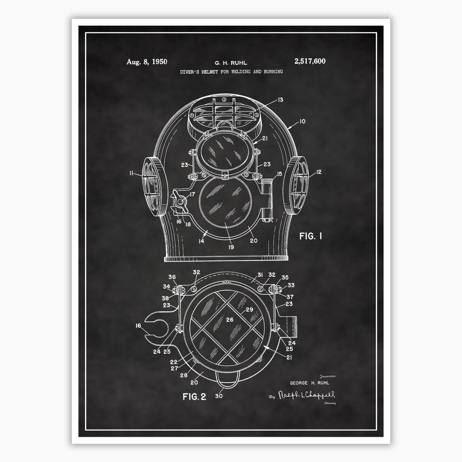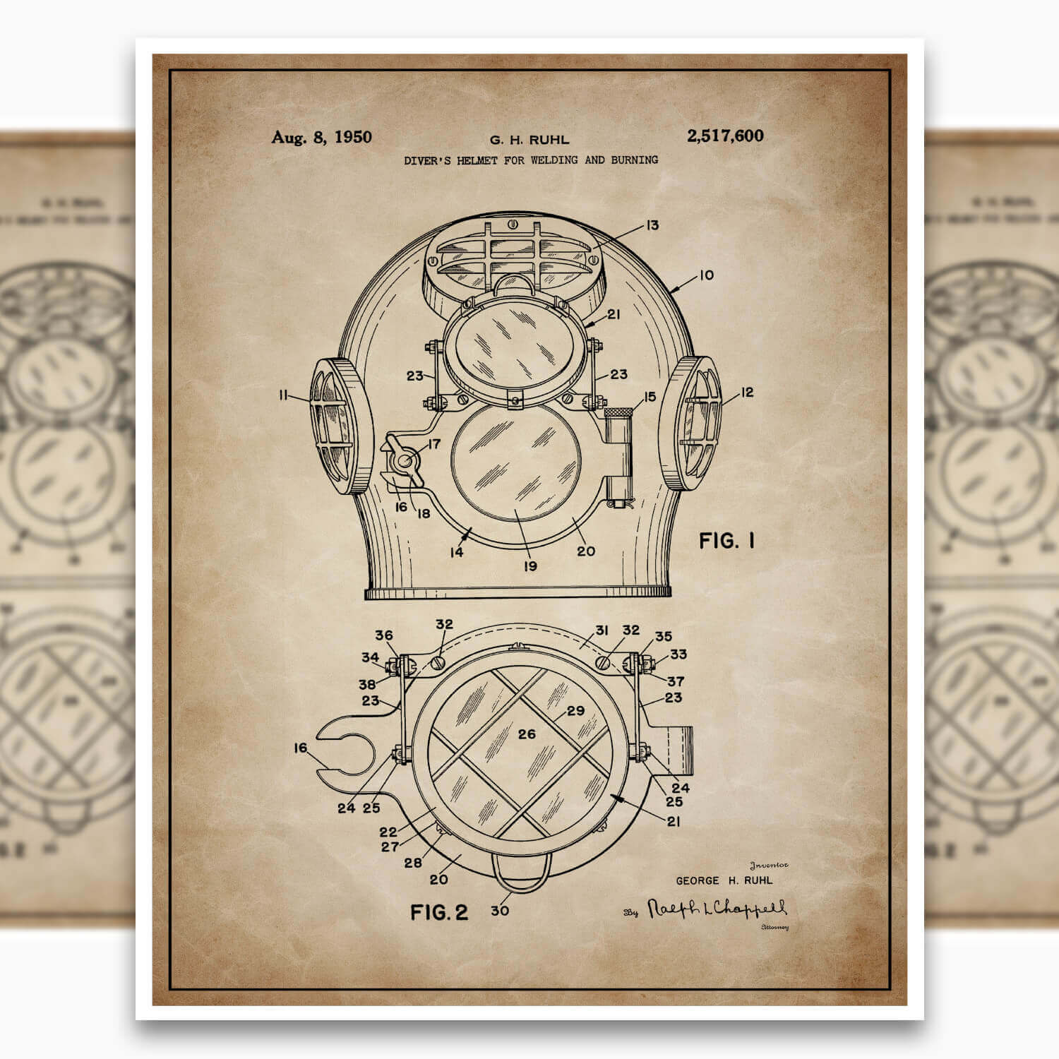 Original, technical patent print for a Mid-20th Century Diving Helmet. This patent was issued by the United States Patent Office on November 13, 1945, to John W Browne.