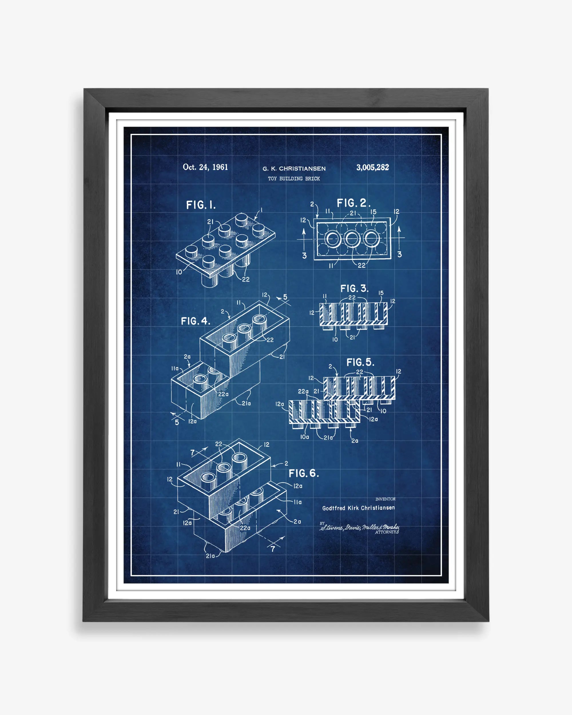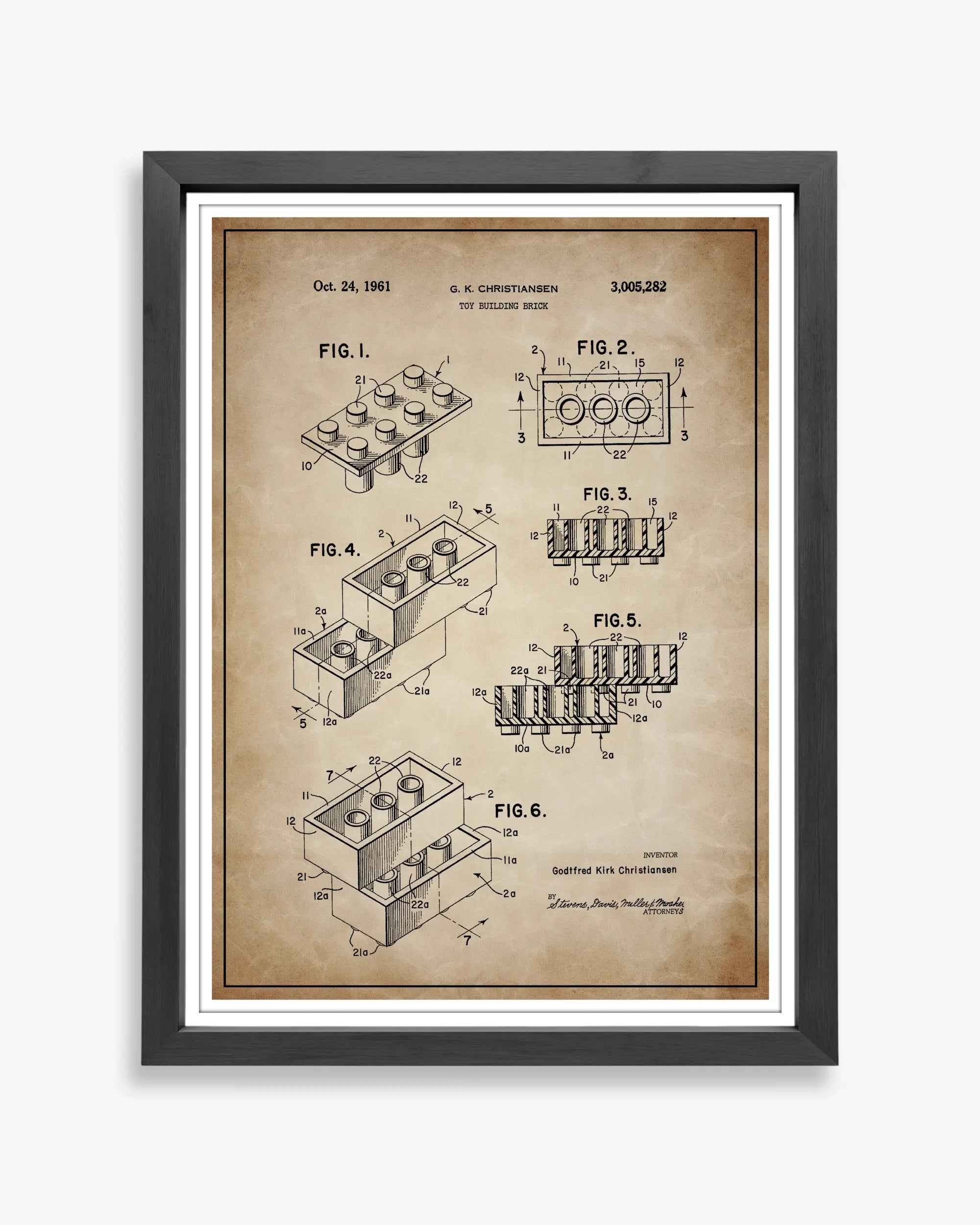 An interlocking toy brick system patented in the United States during the mid-twentieth century, designed for modular construction and repetition. Recorded in patent filings concerned with standardization, fit, and creative assembly.