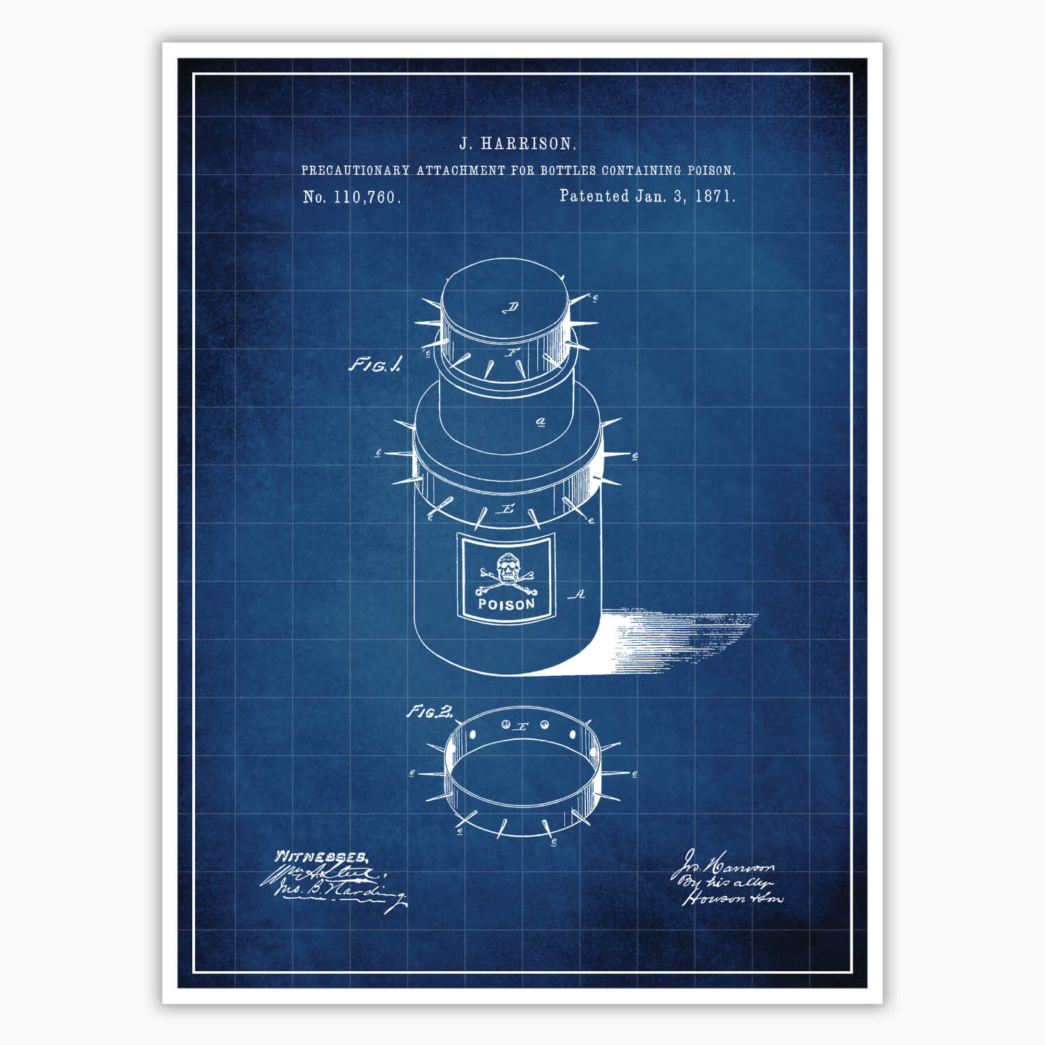 Introducing our Poison Bottle Patent Poster, featuring the original patent blueprint by inventor J Harrison. With attention to detail and captivating design, this patent poster is a remarkable centerpiece for medical enthusiasts, collectors, and macabre lovers. Showcase your admiration for all things spooky with the Poison Bottle Patent Poster, beautifully rendered on 260 GSM Semi-Gloss Photo Paper.