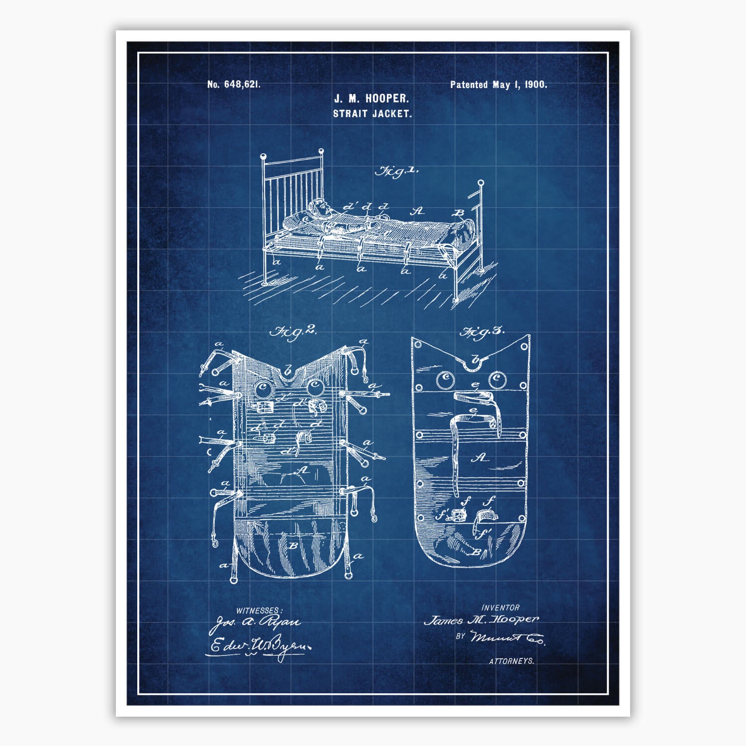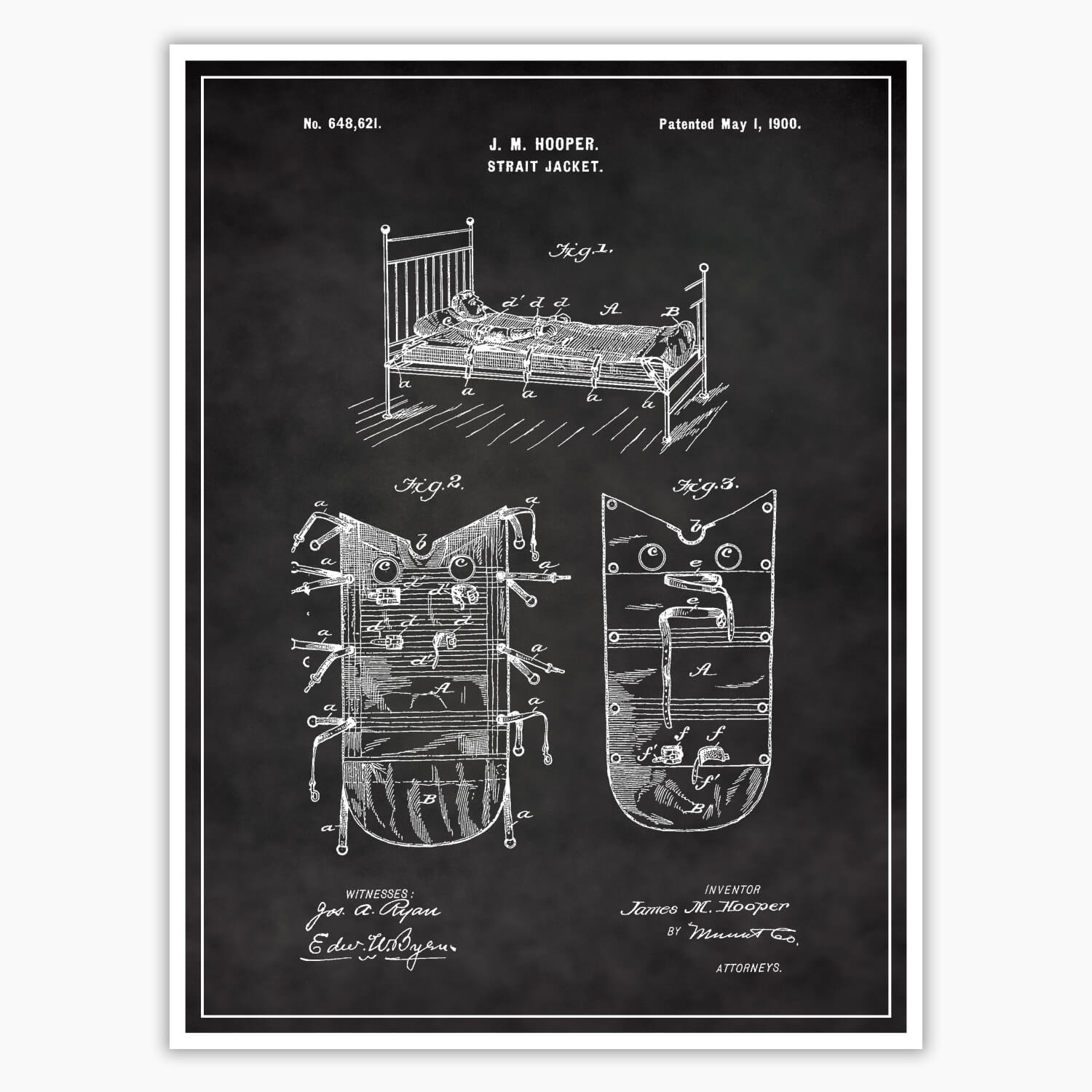 Introducing our Strait Jacket Patent Poster, featuring the original patent blueprint by inventor J M Hooper. With its attention to detail and captivating design, this patent poster serves as a remarkable centerpiece for medical enthusiasts, collectors, and macabre lovers alike. Showcase your admiration for spookiness with the Strait Jacket Patent Poster, beautifully rendered on 260 GSM Semi-Gloss Photo Paper.